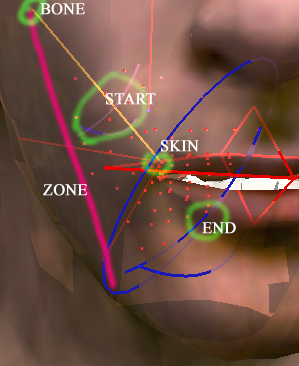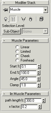 Visibly there are two types of muscles a line and a circle. These mostly correspond to human anatomy. Any book on drawing faces should have at least an introduction to the way that muscles change shape of the face. The set up I have isn't perfect, but its gotten good results. I'm not so sure about the areas around the furrow of the brow and the upper and lower lip anatomically are actually 4 muscles not 2. You can change the muscles by changing the position of the objects as well as a number of custom variable that are set up in the following modifiers. These modifier plug-ins changes 2 basic muscle types into 6 types (seen to the right